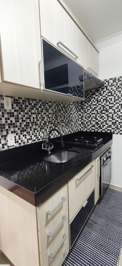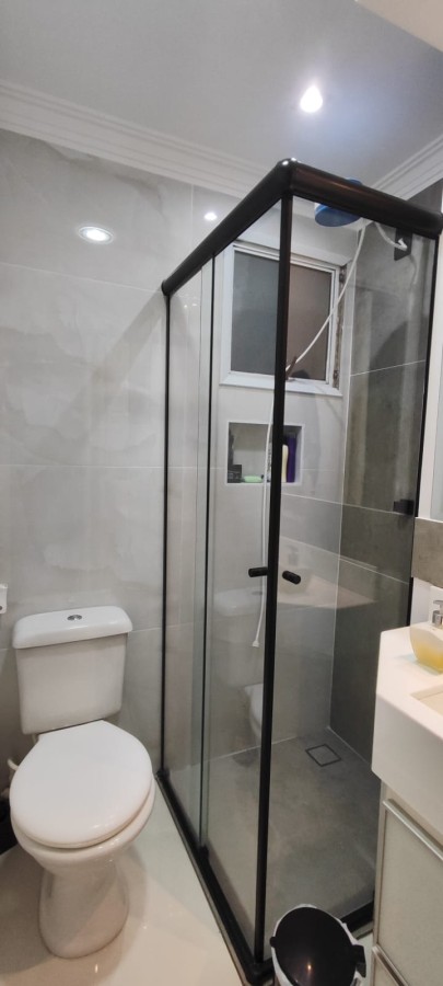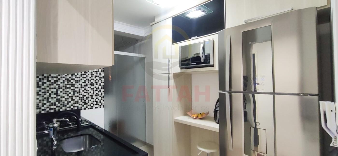 Sala com sacada, Cozinha com móveis planejados e integrada a sala (conceito aberto), 1 banheiro social, Área de serviço com móveis planejados e box de vidro separando-a da cozinha.